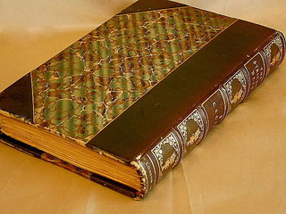 Fine Binding 3/4 dark green calf, on gold and color marbled boards (matching front free end-papers), typical mild bumping of spine ends, wear to board margins, one round loss to green color approx 1/4" diameter from front calf near spine; spine handsomely titled between bands alternating floral-bordered gold urns
