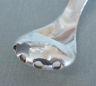 The tiny pocket bowl measures a dose, which does not exit the four pierced holes at its tip until the spoon is held tilted upright in the mouth.