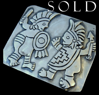 "TWO AZTEC WARRIORS" big bold heavy silver plaque brooch