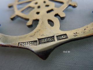 SHIPS WHEEL & FOULED ANCHOR (Quartermaster or Navigator insignia) China Trade Enameled Bronze Badge, suspended from red white & blue macrame KNOT pin Size : total length 4-1/2” x 2-1/2” wide Identifying marks : “C H I N A / No.23 / S.G.” # HHD 46 .................................... $ 275.