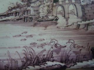 Dutch Landscape Tile, early and painted with exceptional detail -- Soldiers boarding boat beneath a bridge -- distant ship at horizon left, 2 water fowl in foreground